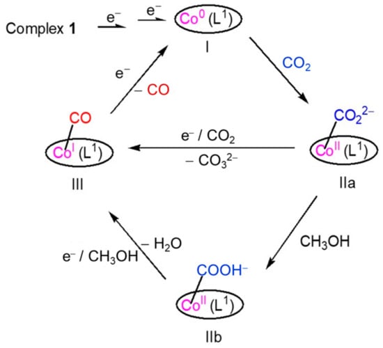 Under CO2, complex 1 exhibits a slight current enhancement around −1.85 V, which is near the potential for CoI/0 couple (Figure 2, red line; Figure S4). A controlled potential electrolysis (CPE) experiment of complex 1 was performed at −1.9 V under CO2. Thereafter, an analysis of the gas mixture, in the headspace of the working compartment of the electrolysis cell, by gas chromatography (GC) identified CO as the exclusive gaseous product under the test condition (Figure S9). The catalytic peak current (icat) varies linearly with the concentration of complex 1, consistent with a mechanism for catalytic CO2 reduction that is a first-order reaction in complex 1 (Figure S10). Under CO2 in the presence of 4 M methanol, the current exhibits a 4.8-fold increase under CO2 conditions in the absence of methanol at −2.1 V (Figure 2 and Figure S11). As documented in the literature, this phenomenon is ascribed to methanol’s role as a proton source, leading to the modification of the catalytic reaction pathway, thereby enhancing the rate of carbon–oxygen bond cleavage of the metallocarboxylate intermediate [4,6,41] (See details in the “The Analysis of Process and Intermediates”). In addition, the catalytic peak current has linear dependence on methanol concentration, ranging from 0.15 to 0.98 M, and reaching saturation at around 4 M (Figure S11). Changing the sequence of bubbling with CO2 and adding methanol results in negligible differences in CVs. In contrast, the addition of methanol results in a 260 mV negative shift of the second couple under Ar (Figure 2 and Figure S12). This observation indicates that CO2 is much more competitive than methanol to coordinate with the reduced catalyst. Under the same test conditions, complex 2 performs an almost identical phenomenon with complex 1 (Figures S5 and S13–S17).