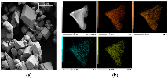 An SEM image of 1b is shown in Figure 1a, while the STEM analysis revealed that the selected fragments were uniform, free of visible defects or secondary phases, and composed of carbon, nitrogen, oxygen, and iron, as determined by energy-dispersive X-ray spectroscopy (EDXS), shown in Figure 1b. The mean value of the iron mass percent of 7.2, estimated by EDXS, agrees with the calculated mass percent of 7.1.