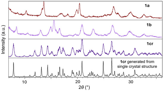 The XRPD pattern of the reddish-brown 1a is different to that of the violet 1b and substantially distinct from 1cr (Figure 2). The similar breadths of the diffraction lines of the hydrated 1a and anhydrous 1b indicate that there is no significant loss of crystallinity upon dehydration.