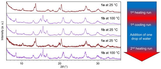 Two cycles of in situ variable-temperature XRPD measurements, showing the temperature-induced release of water molecules from 1a phase resulting in the formation of 1b anhydrous phase that, upon water exposure, transforms back to 1a.