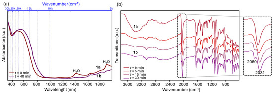 (a) Time-dependent in situ changes in the UV–vis–NIR diffuse reflectance spectrum of 1a upon standing and drying at room temperature, i.e., transforming into 1b; (b) time-dependent in situ ATR-FTIR spectra showing the release of water molecules from 1a, resulting in the formation of anhydrous 1b.