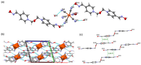 (a) Hydrogen bonding motif around the pentacyanonitrosylferrate core; (b) 2D supramolecular layers parallel to (010); (c) π···π interaction of pyridinium ring and oxime group with perpendicular distances of the centroids Cg of rings and to the planes through their centrosymmetrically related rings.