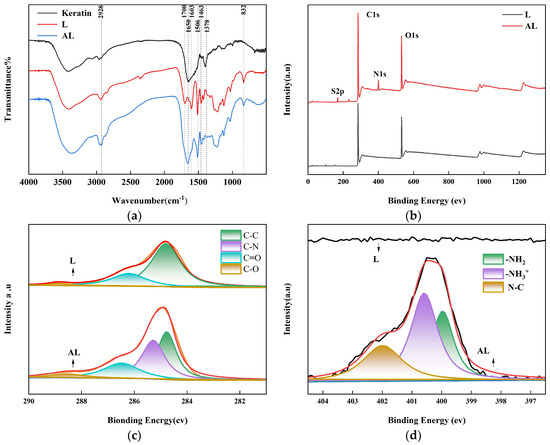 FTIR spectrum of the keratin L, AL (a), XPS spectra of L, AL (b), high-resolution image of C1 of L, AL (c), and high-resolution image of N1 of L, AL (d).