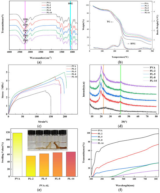 Infrared spectra (a), thermogravimetric (b), stress–strain (c), XRD (d), solubility (e), and UV optical resistance (f) of PVA, PL-2, PL-5, PL-8, and PL-14.