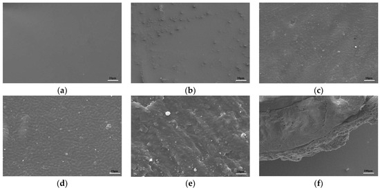 The surface morphology of the pure PVA and composite membranes were characterized as shown in Figure 3a–e. It was showed that the surface of the PVA membranes had a homogeneous and smooth structure. There was no large-scale agglomeration in PL-2, PL-5, or PL-8, indicating that the AL particles were well dispersed in the PVA solution [27]. On the contrary, PL-14 showed a large number of irregular AL clusters under SEM. This large-scale agglomeration may be caused by the incomplete dissolution of excessive AL content. It can be seen from the infrared, stress–strain, and water absorption properties that the performance of PL-14 is affected by this excessive AL agglomeration. Because its performance is remarkable in many aspects with respect to the control groups, PL-8 was selected as the spraying reagent for use in further studies.