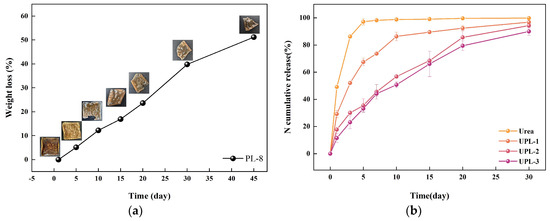 The degradation property of coating materials is an important parameter for designing coated fertilizers for agricultural applications with less negative impact on the environment [48]. We investigated the weight loss (%) of the film after burying it in moist soil for 45 days (Figure 4a). The results showed that the size of the film decreased and the surface of the film became rough and wrinkled after burial in soil. The degradation rate of PL membranes was 16.9% after 15 days of burial in soil, with 51% weight loss observed after 45 days. This is approximately the same as other PVA-doped biomass material films [49]. This was mainly ascribed to the water absorbed by the film expanding the film and accelerating the growth of microorganisms on the surface, promoting the degradation of these composite membranes [12,50]. The above results showed that PL has good biodegradability in soil environments.