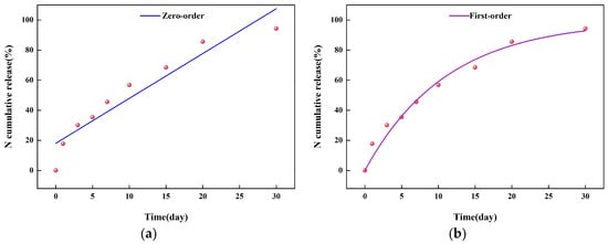 Determination of urea nitrogen release from coated urea in soil was carried out by reference to the method in [48] with some modifications. The experiments were as follows: a polyvinyl alcohol (PVC) column was used, with a length of 45.0 cm and a diameter of 5.25 cm; a blue-capped flask was used to receive the filtrate under the column. The column was filled with 100 g of quartz sand as a substrate. Then, a mixture of sample (1 g) and soil (300.0 g) was placed and covered with 100 g of quartz sand as the top layer. The slow-release columns were stored at room temperature (27 ± 2 °C). To keep the soil at 30% moisture, 150 mL of water at a time was added to the PVC column. The filtrates from each slow-release column were collected after 1, 3, 5, 7, 10, 15, 20, and 30 days and stored at approximately 4 °C for further analysis by Kjeldahl. Untreated urea pellets were studied under the same conditions and served as a control. To evaluate the mechanism of urea release, a mathematical model was fitted to the data.
