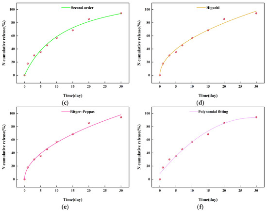 Based on these results, the PL-coated materials exhibited slow-release properties comparable to results reporting that the release of K, P, and N were 96.23%, 95.48%, and 96.31%, respectively, after PVA@CNC14.5%-c-NPK coating product was released in soil for one month [53]. This indicates that AL/PVA film has a slow-release effect with respect to urea and can be used as a coating material with slow-release properties. The results show that the thickness of the coating is an important parameter that can significantly control nutrient release [54]. In addition, based on the experimental data on urea release from the composite membranes, different kinetic models were used to fit the retardation curves of urea. The fitting results are shown in Table 1 and Figure 5. The coefficient of determination R2 was used to evaluate the degree of fitting. From the fitting equations and the coefficient of determination R2, the validity of the fitted retardation models was in the following order: Ritger–Peppas model > Higuchi model > second-order kinetic model > polynomial fitting model > first-order kinetic model > zero-order kinetic model.