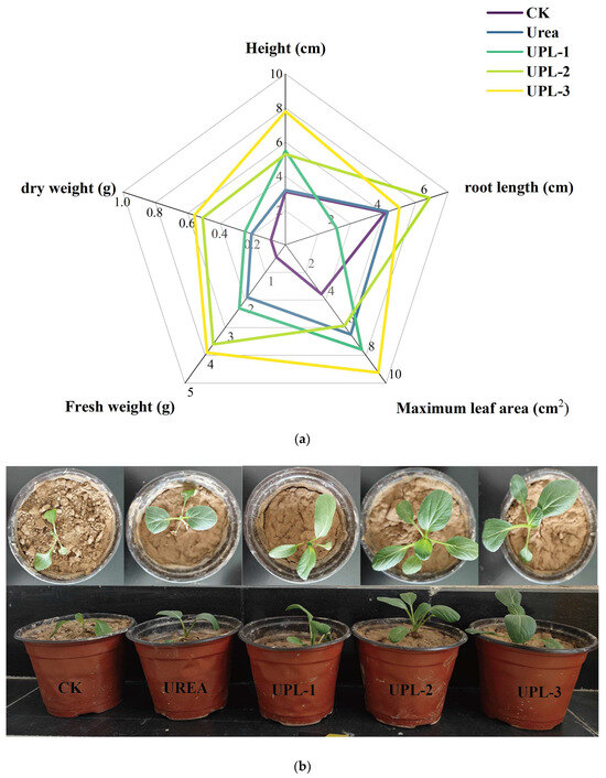 This experiment was conducted from 21 October 2023 to 21 November 2023. Each pot was filled with 300 g of soil. Soil physicochemical properties were nitrate nitrogen 12.56 mg/kg, ammonium nitrogen 9.31 mg/kg, rapidly available phosphorus 26.30 mg/kg, and rapidly available potassium 136.29 mg/kg. Five treatments were set: (1) nitrogen-free control (CK); (2) urea 0.5 g/pot (U); (3) 0.505 g UPL, 1% coated/pot (UPL-1); (4) 0.510 g containing 2% coating/pot (UPL-2); and (5) 0.515 g containing 3% coating/pot (UPL-3). The same amount of nitrogen was applied to each treatment and repeated three times. Potassium dihydrogen phosphate (0.5 g/pot) and potassium sulphate (0.6 g/pot) were applied as basal fertilizers according to local fertilization practices. All nitrogen fertilizers were applied as basal fertilizers, and the amount of fertilizer was doubled in the pot experiment. After harvesting, the dry weight, fresh weight, plant height, root length, and maximum leaf area were determined