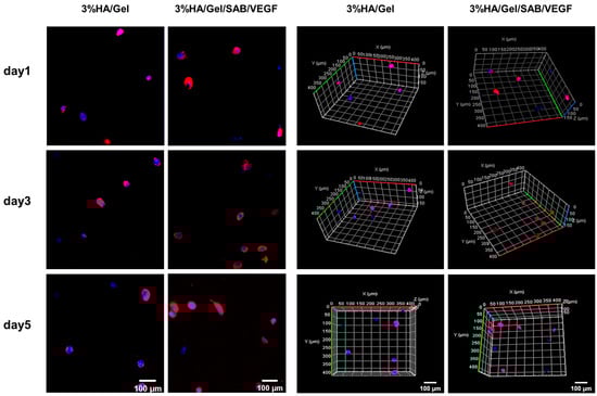 Two-dimensional (2D) (left column, scale bar = 100 μm) and 3D (right column, scale bar = 100 μm) immunofluorescence staining with Phalloidin (red)/DAPI (blue) of BMSCs loaded in 3% HA/Gel/SAB/VEGF hydrogels after 5 days of culture, photographed using confocal microscopy.