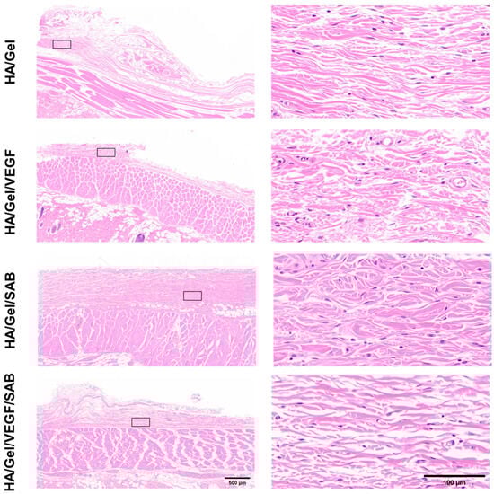 Representative low (left column, scale bar = 500 μm) and high (right column, scale bar = 100 μm) magnification images of H&E-stained histological sections at 14 days post subcutaneous implantation of different hydrogels.