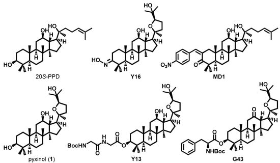 Structures of 20S-PPD, pyxinol, and its derivatives.