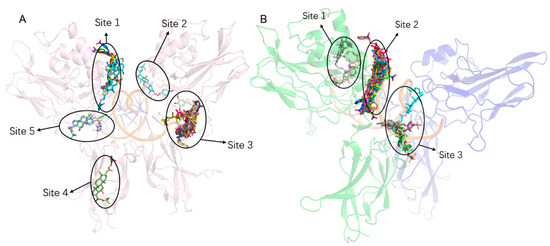 Predicted binding modes for selected pyxinol derivatives with (A) the p50 homodimer (PDB: 1NFK) and (B) the p65–p50 heterodimer (PDB: 1VKX).
