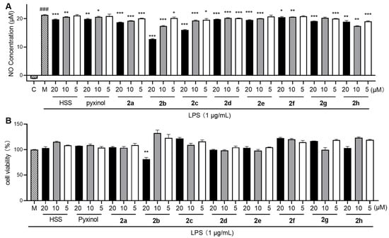 The release of NO is a typical inflammatory response elicited in various inflammatory diseases. It is a key indicator used to evaluate the anti-inflammatory activity of a compound [39,40]. Here, we evaluated the NO inhibition activities of all synthesized pyxinol derivatives in LPS-triggered RAW264.7 cells, and HSS was used as a positive control. The Griess assay results confirmed that LPS (1 μg/mL) largely triggered the release of NO (Figure 3A). Except for derivative 2f, the remaining derivatives significantly inhibited the LPS-triggered release of NO (p < 0.05) and exhibited stronger inhibitory activity than did the parental pyxinol in a dose-dependent manner. Of these, the size of the modification moiety obviously affected the NO-inhibitory activity of the derivatives (2a–2c vs. 2d–2g). The introduction of a linker reduced the effect of the large modification moiety on its NO-inhibitory activity (2h vs. 2d–2g). Notably, derivatives 2b and 2c had the most potent suppression of the LPS-triggered release of NO, which was better than the ability of HSS.