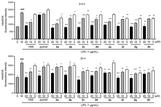 Inflammation can change in the cell microenvironment by increasing the generation of ROS [41]. Moreover, ROS promotes inflammation, resulting in a vicious cycle [41]. In particular, LPS-triggered generation of MtROS is an alternative key inflammatory response that causes cell damage [42,43]. A mitoSOX assay was performed to evaluate the inhibitory effect of the derivatives on LPS-triggered generation of MtROS. LPS treatment markedly triggered the generation of MtROS in the macrophages, evidenced by an increase in the fluorescence intensity of mitoSOX during short-term (0.5 h) and long-term (24 h) treatment (Figure 4) in a dose-dependent manner. Most of the pyxinol derivatives had better inhibitory activity than pyxinol. Derivative 2c showed the most potent ability to suppress the LPS-triggered generation of MtROS, which was better than that of HSS, especially during short-term treatment. Thus, 2c displayed the highest NO- and MtROS-inhibitory activities with low cytotoxicity and was selected for further studies.
