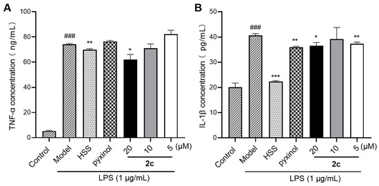 Effect of derivative 2c on the LPS-triggered release of (A) TNF-α and (B) IL-1β in RAW264.7 macrophages. The macrophages were pre-treated with 2c (5, 10 and 20 μM) or HSS (20 μM) for 2 h before 6 (for TNF-α) or 24 h (for IL-1β) of stimulation with LPS (1 μg/mL). The levels of TNF-α and IL-1β were analyzed using Elabscience ELISA kits. Data are expressed as the means ± SD (n = 3): ### p < 0.001 vs. the control group; * p < 0.05, ** p < 0.01, *** p < 0.001 vs. the model group.