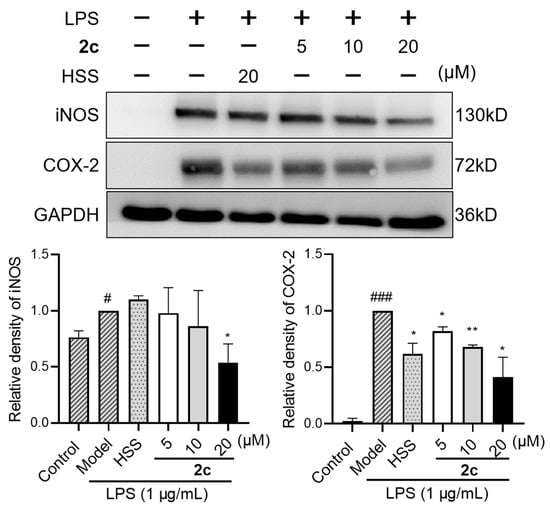 Effects of derivative 2c on the LPS-triggered generation of iNOS and COX-2 in RAW264.7 macrophages. The macrophages were pre-treated with 2c (5, 10 and 20 μM) or HSS (20 μM) for 2 h before 24 h of stimulation with LPS (1 μg/mL). Data are expressed as the means ± SD (n = 3): # p < 0.05, ### p < 0.001 vs. the control group; * p < 0.05, ** p < 0.01 vs. the model group.