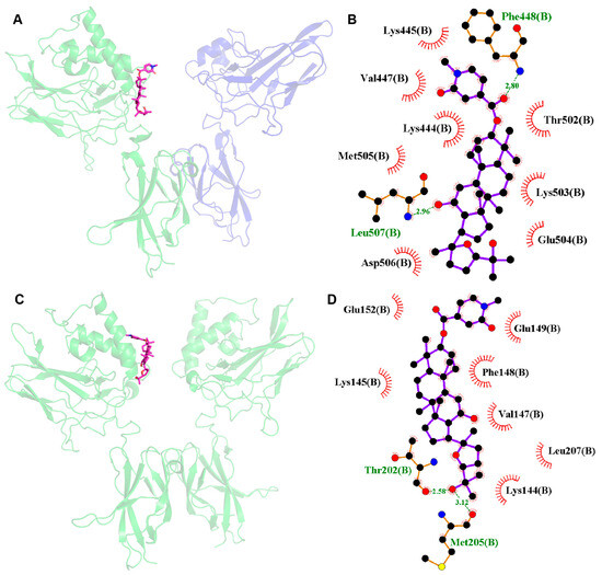 Molecular docking analysis was performed using the p65–p50 heterodimer (PDB: 1VKX) and p50 homodimer (PDB: 1NFK) to elucidate the molecular mechanism of 2c in reducing inflammation via NF-κB. The binding sites of 2c in the two dimers with the highest estimated binding affinity are depicted in Figure 9. Derivative 2c bound to both dimers at a similar site on the p50 subunit via hydrophobic interactions. Hydrogen bonding was observed in the p50 homodimer between the hydroxy group at C-25 and Thr202 (-OH⋯OC-Thr202, 2.58 Å), in the p65–p50 heterodimer between the hydroxy group at C-12 and Leu507 (-O⋯HN-Leu507, 2.96 Å), and between the ester linker and Phe448 (-CO⋯HN-Phe448, 2.80 Å). In the p50 homodimer, the 2c binding site exhibited the function of binding to DNA and maintaining the stability of the homodimer [34]; thus, p50 was stabilized by 2c at a high temperature in the CETSA. The p50 homodimer is an atypical NF-κB species, which exhibits the anti-inflammatory activity by impeding the expression of NF-κB’s target gene [4]. Therefore, the binding of 2c to the p50 homodimer in order to maintain the homodimers’ stability is one of the potential molecular mechanisms underlying its anti-inflammatory activity. In the p65–p50 heterodimer, the 2c binding site was close to the acidic tail binding site [33,48] of the p65 subunit and IκB, which probably impeded the phosphorylation of p65, thereby suppressing inflammation (Figure 9A,B). Such interactions enhanced the p65–p50 heterodimer’s stabilization at a high temperature, resulting in the stabilization of p65 in the CETSA. The p65–p50 heterodimer is the active form of NF-κB. The phosphorylation of the p65 subunit of the heterodimer promotes its nuclear translocation and transactivates major proinflammatory genes associated with inflammation. Thus, another potential molecular mechanism of anti-inflammatory activity of 2c is that it binds to the p65–p50 heterodimer to impede the phosphorylation of p65. However, these molecular mechanisms of 2c should be further confirmed.
