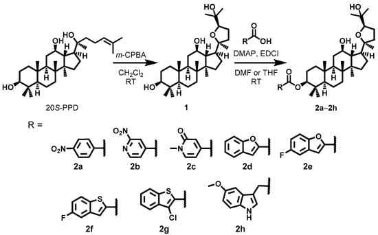 Pyxinol (1) was prepared using commercial 20S-PPD by one-step epoxidation and purified by recrystallization as described previously [16,38] (Scheme 1). The C-3-selective esterification of pyxinol (1) with the corresponding carboxylic acid was catalyzed by 4-dimethylaminopyridine (DMAP) in dried DMF or THF to synthesize the target derivatives (2a–2h). The structures of the final pyxinol derivatives were verified by 1H-nuclear magnetic resonance (NMR), 13C-NMR, and high-resolution mass spectroscopy (HRMS).