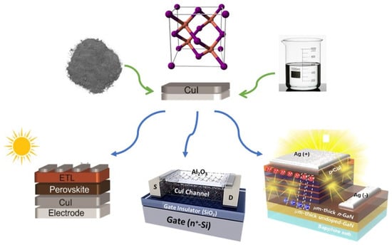 Copper iodide thin films can be produced through both neat and wet methods, from powder CuI and solution of CuI respectively (green arrows), and exhibit functionality in perovskite solar cells (PSCs), thin-film transistors (TFTs), and light-emitting diodes (LEDs) (blue arrows) [40,41].