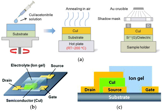 (a) Spin-coating process to fabricate CuI TFT [54]; (b,c) schematic and cross-section of a vertical TFT (VTFT) with a CuI channel layer and an ion gel electrolyte–gate insulator in a side-gated configuration [55].