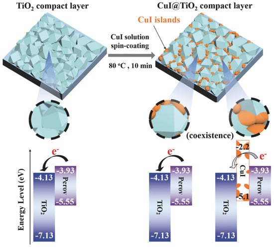 A diagram illustrates the process of CuI island formation on the TiO2 compact layer, followed by the deposition of a perovskite layer. In devices based on CuI-modified TiO2 (CuI@TiO2), electrons originating from the perovskite layer migrate towards the exposed surface of TiO2 but are unable to transfer to the CuI islands due to the significantly higher energy level of its conduction band [57].