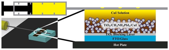 Christians et al. reported the deposition of CuI solution by the drop casting method [66]. CuI was dissolved in a mixture of n-propyl sulfide−chlorobenzene solvents. As is shown in Figure 6, a syringe with a perforated needle in the upper section was positioned above the 80 °C TiO2/CH3NH3PbI3 film. An automated mechanical motor was employed to move a droplet of CuI solution across the substrate. This facilitated the uniform deposition of CuI solution over the entire solar cell, effectively filling the porous TiO2/CH3NH3PbI3 structure and creating a CuI layer with a thickness of around 1.5−2.0 μm. Consequently, the power conversion efficiency (PCE) of the CuI-based perovskite solar cells (PSCs) reached 6.0%.