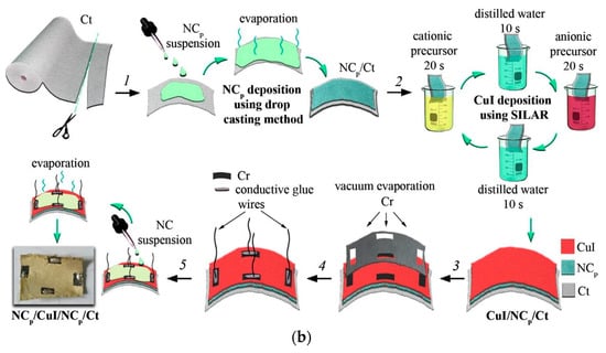 In 2021, another study by N.P. Klochko et al. added the polymer nanocellulose (NCp) sublayer on the CuI film with an average thickness of 10 µm, within the wearable thermoelectric textile. The developed module demonstrated an impressive output power density of 44 µW/cm2 at a temperature gradient of 50 K, which is one of the best results currently known for solid, miniature, flexible, and fabric- and textile-based thermoelectric generators (TEGs) [69]. The process of fabrication and SILAR method of CuI is illustrated in Figure 7b.