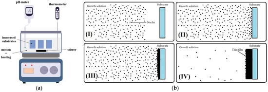 (a) Experimental arrangement for the chemical bath deposition (CBD) method; (b) diagram illustrating the progression of nanomaterial growth via chemical bath deposition (CBD) over time. (I) Initiation of nuclei formation, (II) migration of nuclei towards the substrate surface, (III) aggregation of nuclei and initiation of thin film growth, and (IV) saturation of the deposition solution marking the completion of growth [74].