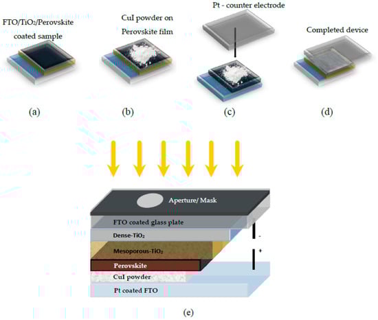 (a–d) Sequential diagram illustrating the powder pressing technique for integrating CuI powder as the hole-transport material (HTM) in perovskite solar cells (PSCs), and (e) schematic depiction of the CuI device architecture with yellow arrows as sunshine [94].