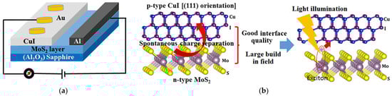 (a) Diagram illustrating the γ-CuI/MoS2 heterojunction device. (b) Crystal structures viewed in cross-section of cubic γ-CuI along the (111) plane atop MoS2 layers; the presence of γ-CuI (111) facilitates the establishment of a productive heterojunction interface, conducive to exciton dissociation and separation [98].