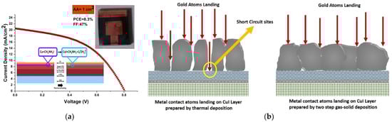 (a) Illustration depicting the CuI formation interaction at the interface between the CH3NH3PbI3 and Cu layers [99]; (b) depiction of the migration of Au atoms through the pinholes in the thermally deposited CuI and CuI produced via the gas–solid method [100].