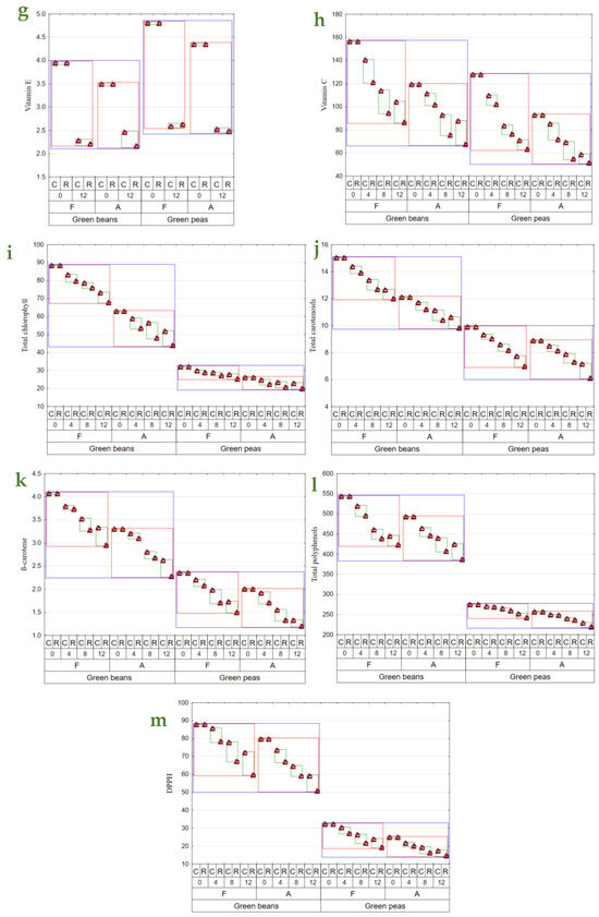 Mean values of: (a)—water content (g × 100 g d.f.−1); (b)—water absorption (g × 100 g d.w.−1); (c)—aw; (d)—color parameter L; (e)—color parameter a*; (f)—color parameter b*); (g)—vitamin E content (mg × 100 g d.w.−1); (h)—vitamin C content (mg × 100 g d.w.−1); (i)—total chlorophyll content (mg × 100 g d.w.−1); (j)—total carotenoid content (mg × 100 g d.w.−1); (k)—β—carotene content (mg × 100 g d.w.−1); (l)—total polyphenol content (mg (+)catechin × 100 g d.w.−1); (m)—antioxidant activity against a radical DPPH (μmol Trolox equivalent × g d.w.−1) in vegetable green beans and green peas (blue line), depending on the method of drying (F—freeze-drying; A—air-drying; red line), storage period (0, 4, 8, 12 months), and temperature of storage (C—2–4 °C; R—18–22 °C; green line).