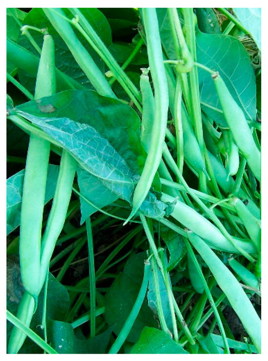 Green beans (Phaseolus vulgaris L.), as seen in Figure 4, are of the ‘Gracja’ cultivar, produced by the Polan company (Poland). The growing season from sowing until the harvest of green pods spanned 80–90 days. The pods were green, 11–13 cm long, 0.8–0.9 cm wide, round in cross-section, stringless, straight in shape, and set in the central part of the plant. Properly developed pods were harvested at the end of July, during rainless weather.