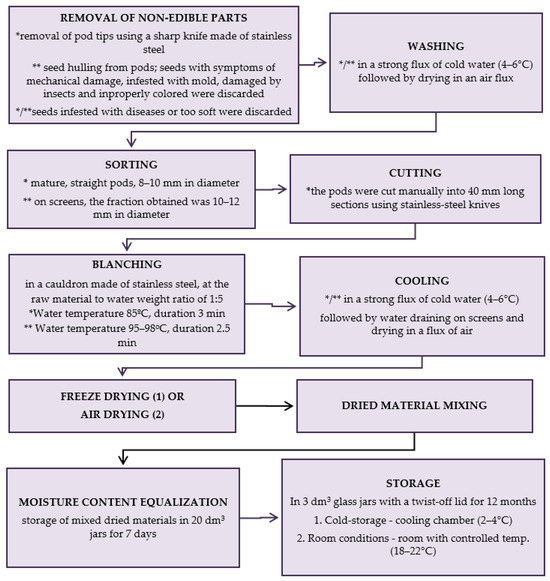 Scheme of production of dried materials; * green beans, ** green peas; methods (1) and (2) are described below. (1) Freeze-drying; firstly, the vegetables were arranged in a single layer on trays of a freeze-dryer (vegetable load per 1 m² of trays was 7.5 kg) and frozen at a temperature of −40 °C in a Feutron 3626-51 freezing chamber (Germany). The time required to reach −30 °C inside the frozen vegetables was 90 min. The frozen vegetables were freeze-dried in a Gamma 1–16 LSC freeze-dryer (Christ, Germany) at the following conditions: 1. initial drying: temp. of frozen material (−30 °C); temp. of a condenser (−52 °C); temp. of shelves (+20 °C); 2. additional drying: the last approx. 6 h of the total drying time (temp. of shelves +30 °C). Drying time at a shelf load of 7.5 kg × m−2 to the water content < 3% assumed in Methods; * green beans—28 h, ** green peas—30 h; (2) Air-drying; air drying was done using electric air dryers (Zorpot Zalmet, Poland). The vegetable load was 8.5 kg × m−2 screen surface area. The inlet hot air temperature was 60 °C. Drying was continued until the dried vegetables had 10% moisture content. * green beans—8 h, ** green peas—9 h.