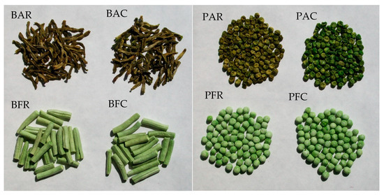 Dried green beans (B) and green peas (P) after twelve months of storage; A—air-dried, F—freeze-dried, R—room storage, C—cooling storage.