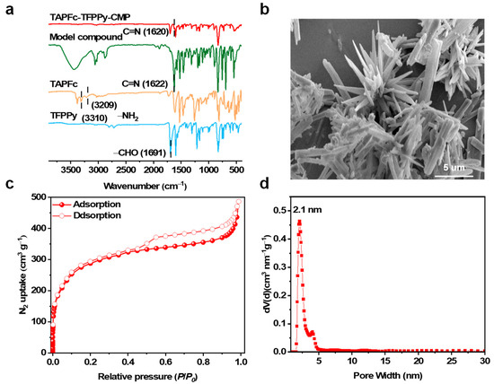 (a) FT-IR spectrum of TFPPy (blue), TAPFc (orange), model compound (green), and TAPFc-TFPPy-CMP (red). (b) FE-SEM image; (c) N2 sorption isotherms at 77 K; and (d) pore size distribution curve of TAPFc-TFPPy-CMP.