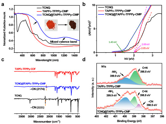 (a) UV–Vis DRS spectra, optical images (inside), (b) Tauc curve, and (c) FT-IR spectra of TCNQ (black), TAPFc-TFPPy-CMP (red), and TCNQ@TAPFc-TFPPy-CMP (blue). (d) XPS spectra of TAPFc-TFPPy-CMP (upper) and TCNQ@TAPFc-TFPPy-CMP (lower).