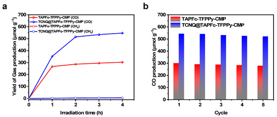 (a) Photocatalytic CO and CH4 evolution and (b) recycling performance of TAPFc-TFPPy-CMP (red) and TCNQ@TAPFc-TFPPy-CMP (blue) for the photocatalytic CO2 reduction reaction.