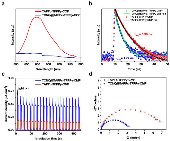 (a) PL spectra, (b) FL spectra, (c) photocurrent response, and (d) EIS spectra of TAPFc-TFPPy-CMP and TCNQ@TAPFc-TFPPy-CMP.