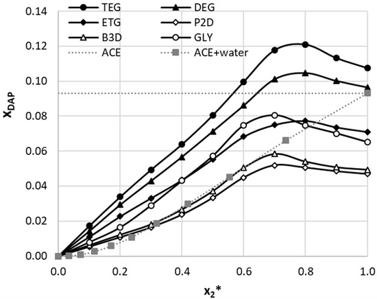 The solubility profiles of dapsone at room temperature (T = 25 °C) expressed as solvent composition-related mole fractions. The following notation was adopted: (1:2) choline chloride DESs with propane-1,2-diol (P2D), butane-1,3-diol (B3D) glycerol (GLY), ethylene glycol (ETG), diethylene glycol (DEG), triethylene glycol (TEG), and acetone (ACE)-water [27], where x2* stands for mole fractions of solute-free DES or ACE in aqueous mixtures.