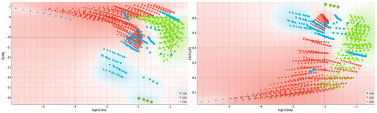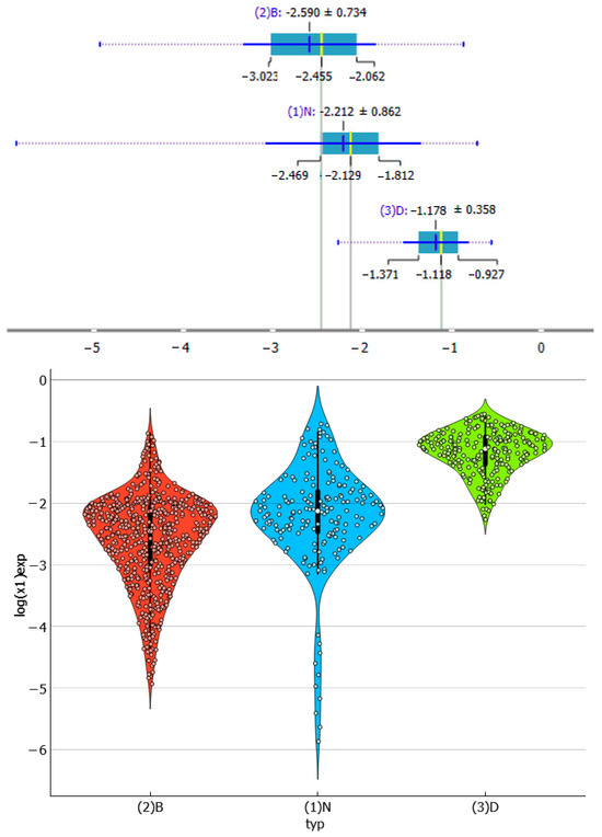 Hence, the collection of dapsone solubilities is divided into three subsets: pure solvents, (1)N, binary solvent mixtures, (2)B, and binary deep eutectic solvents supplemented by ternary water-diluted eutectic systems, (3)D. The number of species in each subset, including their temperature and composition dependencies, is not uniformly distributed. The subset with the most experimental data points is the one collecting binary solvent mixtures. The other two categories are represented by a smaller but similar number of points. This may raise concerns about imbalance or misrepresentation, but from the perspective of this paper, it is not a serious limitation and does not affect the conclusions. The diversity of binary mixtures is rather limited and is also mostly covered in the neat solvent subset. Hence, binary solvent data do not introduce a bias. The solubility distributions are shown in Figure 3 as box and violin plots. As it might be anticipated, the three types of solvents exhibit significant differences. The box plot indicates that DES systems have the highest median solubility values, with log(xD) = −1.11, which is one logarithmic unit higher than the other two types of systems. It appears that the use of binary mixtures does not enhance the solubility of dapsone, as evidenced by the comparison of corresponding medians. This suggestion is also supported by the violin plot. The clearly detectable tail in the case of neat solvents corresponds to the lowest values represented by the dissolution of dapsone in pure water within the measured temperature range. Similarly, the tail in binary mixtures is associated with a high water content in the binary mixtures. Additionally, the box plot documents that the solubility data have the highest diversity for pure solvents. Indeed, some dissolution media, such as acetone or NMP, are as effective as many DES systems. This is also true for the low water content of these solvents when binary mixtures are used to dissolve dapsone. However, in general, the majority of DESs are superior to most other solvents. The only few exceptions are highly diluted DESs with a mole fraction of water equal to 0.9. It is worth mentioning that this kind of inferring with the identification of interesting cases can be performed straightforwardly using Orange data mining software using the attached file in supporting materials.