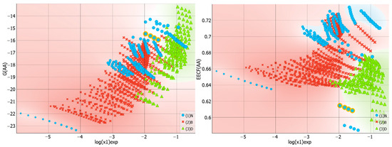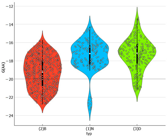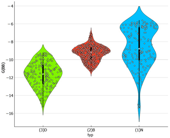 The third type of interactions characterizes the mutual affinities of solvent molecules as the averaged values of solvent molecules self-association and hetero-molecular pairs formation. This type of interactions is supposed to be a potential indicator of readiness to solute dispersion by the environment and might be a crucial factor determining saturated system composition. Inspection of the overall distributions of solute–solute interactions presented in Figure 8 leads to a direct conclusion about the diversities of solvents. For example, the rather narrow range of types of molecules constituting the binary systems subset is clearly reflected in the very narrow span of affinities. To the contrary, the neat solvents subset exhibits much higher heterogeneity. What is a bit surprising is that DESs are quite diverse. In general, these solvents are characterized by the strongest internal stabilization forces. The visible tail on the violin plot for neat solvents corresponds to the strongest solvent–solvent interactions in the case of TEPA. All binary solvents are very similar if G(BB) values are taken into account.