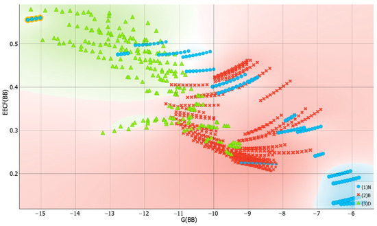 It is interesting to inspect if there is any detectable trend in solvent–solvent interactions and dapsone solubility. This is visualized in Figure 9, which collects both the distributions of affinity and EECF(BB) values for this type of interactions. First of all, it is interesting to notice that systems with high dapsone solubility are in general characterized by quite diverse solute–solute affinities, and only TEPA and diethylene glycol bis(3-aminopropyl) ether (B3P) are similar in this respect. However, there are systems like acetone and the majority of esters, which are also very effective solvents for dapsone, but their intermolecular interactions determining internal structure are quite low. This can be understood in light of the mechanism of dapsone dissolution, already discussed in our earlier works [30,71]. It was argued that dapsone can interact via either hydrogen bonding motives or, due to the quite large hydrophobic part of the molecule, via non-specific interactions of dispersion nature. Hence, such bivalent ability allows for a variety of mechanisms of dissolution, even with distinct solvents. In the right part of Figure 9, the EECF distribution is presented for solvent–solvent interactions. It is interesting to note that both presented trends are of the opposite character. Hence, inspection of the direct relationships between G(BB) and EECT(BB) seems to be worth presentation. Indeed, this is documented in Figure 10 by the plot correlating the values of solvent–solvent affinities with the enthalpy-entropy compensation factor, EECF. It is interesting to notice that there is a fairly linear trend between these two values, and the increase in G(BB), characterizing the decreasing affinity, is associated with the decrease in EECF(BB). This suggests that such solvents, which are characterized by low self-affinities, in general are more disordered, as inferred from the higher contribution from the dominance of entropic contributions. Indeed, the left-bottom corner is occupied with light esters and acetone, i.e., non-protic systems. In such cases, the values of EECF reach 20% at most. On the contrary, for protic components, such as TEPA or many DESs, the enthalpic contribution dominates, exceeding 50%. This emphasizes the fact that the enthalpy factor is crucial for enhancing the solvent–solvent interactions.