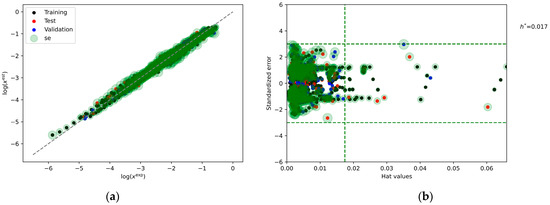 (a) The representation of the accuracy of the developed NuSV regression model characterizing the relationship between computed and measured logarithmic values of dapsone mole fraction in saturated conditions. The values of the optimized model parameters are the following C = 9.995195013432355, degree = 2, gamma = 0.6489637022275867, and nu = 0.13135730736919388. The importance of the descriptors was found to be as follows: G(AA) = 1.33, G(AB) = 0.46, G(BB) = 0.69, EECT(AA) = 0.42, EECT(AB) = 0.49, and EECT(BB) = 0.82. (b) The applicability domain analysis as a qualitative diagnostic metric is provided.