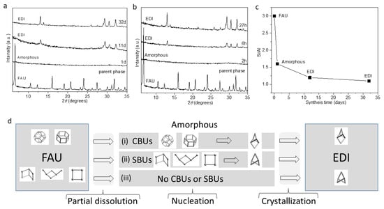Since the parent (FAU) and daughter (EDI) phases do not share common secondary or composite building units (https://www.iza-structure.org/databases/; accessed on 9 April 2024), it can be hypothesized that there are at least three routes for the transformation of the FAU-derived X-ray amorphous phase into EDI zeolite (Figure 1d): (i) the sodalite (sod) and the double six-ring (d6r) of the FAU structure transform to the natrolite (nat) CBU typical for EDI zeolite; (ii) secondary building units (SBUs) such as the 4-2, 1-4-1 or 4 of the FAU framework transform into 4 = 1 units typical for the EDI framework (https://www.iza-structure.org/databases/; accessed on 9 April 2024); or (iii) the transformation starts from the amorphous phase that lacks any secondary building units known for being in the parent and daughter phase. Similar IZTs between structures that do not share common CBUs rarely occur without using seeds or OSDAs [].