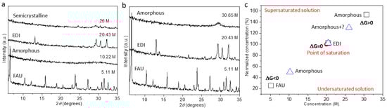 Figure 2a,b shows the powder XRD patterns of the phases obtained via HT and RT IZTs, respectively, performed at different KOH concentrations. The high (26 M and 30.65 M) (samples no. 15 and 11) or relatively low (5.11 M and 10.22 M) (samples no. 10, 12, 13, 14, and 16) concentrations hinder the IZT to EDI zeolite at the selected time and temperature conditions. In the case of a high concentration, the run product is mainly in an amorphous phase and only weak and unindexed PXRD peaks suggest a competing process of crystallization. At low concentrations, the FAU structure remains preserved (5.11 M) (samples no. 10, 13, and 16) or transforms into an amorphous phase (10.22 M) (samples no 12 and 14). It is interesting to notice that at a low KOH concentration (5.11 M), the FAU structure contains a lower Si/Al ratio (2.1) (sample no. 13) than the parent FAU phase, pointing to an effective desilication without structural collapse. By plotting the relative saturation level versus the reference concentrations (Figure 2c) for the RT and HT conditions, it appears that the IZT is closely linked to the level of solution saturation (Figure 2c). A slightly supersaturated solution of KOH (20.43 M) (sample no. 7) creates conditions for crystallization, while the highly supersaturated one (30.65 M) (sample no. 11) inhibits the crystallization of EDI zeolite at RT. The undersaturated solution (5.11 M) (sample no. 10) is also not favorable for the FAU-to-EDI transformation at RT. Under HT conditions, both undersaturated and supersaturated solutions are not favorable for the crystallization of EDI zeolite for 6 h of synthesis. However, similar to the RT approach, the solution with a concentration close to the saturation point leads to EDI zeolite (Figure 2c). Considering the thermodynamics of a system, a solution in equilibrium is a saturated one and has Gibbs free energy (ΔG) that is close to zero. In the cases of supersaturated and undersaturated solutions, the ΔG is positive and negative, respectively. Appling these considerations to our system, it appears that EDI zeolite crystallizes from a solution that is close to equilibrium (Figure 2c). From the chemical point of view, the saturation levels influence the number of OH groups in the solution, thus affecting the dissolution level of the structural subunits. Accordingly, in an undersaturated solution, the parent phase is preserved while the saturated and supersaturated solutions result in a collapsed parent phase.