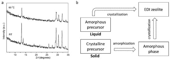 (a) Powder XRD patterns of EDI zeolite obtained from gel at room temperature (RT) for 32 d (sample no. 18) and at 60 °C for 22 h (sample no. 17) of synthesis. (b) Schematic presentation of the two pathways to EDI zeolite.