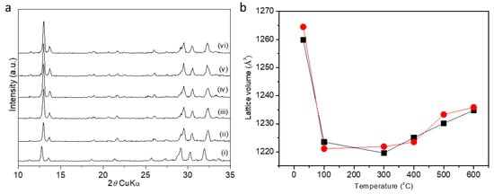 Figure 4 shows the powder XRD patterns and the related changes in the lattice volume of EDI zeolite (sample 8) between 30 and 600 °C refined by using a tetragonal (S.G. P-42m) and a orthorhombic (S.G. I222) lattice, respectively. When a tetragonal system is considered, the lattice volume shrinks by 3.5% at 100 °C. This step is followed by a lattice expansion of 1.2% at 600 °C. In the case of the assumed orthorhombic symmetry, the reduction in the cell volume by 3.3% finishes at 300 °C. In both cases (orthorhombic and tetragonal symmetry), the initial lattice shrinkage is due to dehydration of the structure []. Above 300 °C, gradual thermal expansion starts and at 600 °C, the lattice volume expands by 1.2%. Such a combination of negative followed by positive thermal expansion has been previously observed for the FAU type of zeolites [].