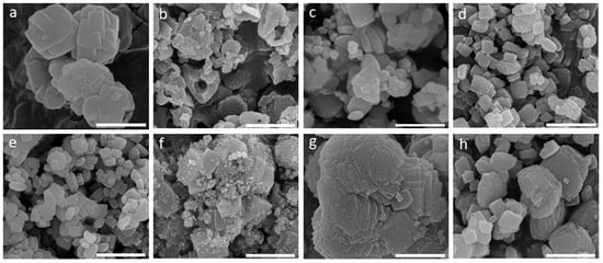 SEM images of the (a) parent FAU zeolite, the (b) amorphous phase obtained after 1 d, and the (c) EDI zeolite obtained after 12 d, (d) after 32 d, and (e) after 35 d of RT synthesis. (f) EDI zeolite obtained via IZT at 60 °C for 27 h. Classical synthesis of EDI zeolite (g) under HT conditions (60 °C) for 22 h and (h) at RT for 32 d of synthesis (bar = 1 µm).